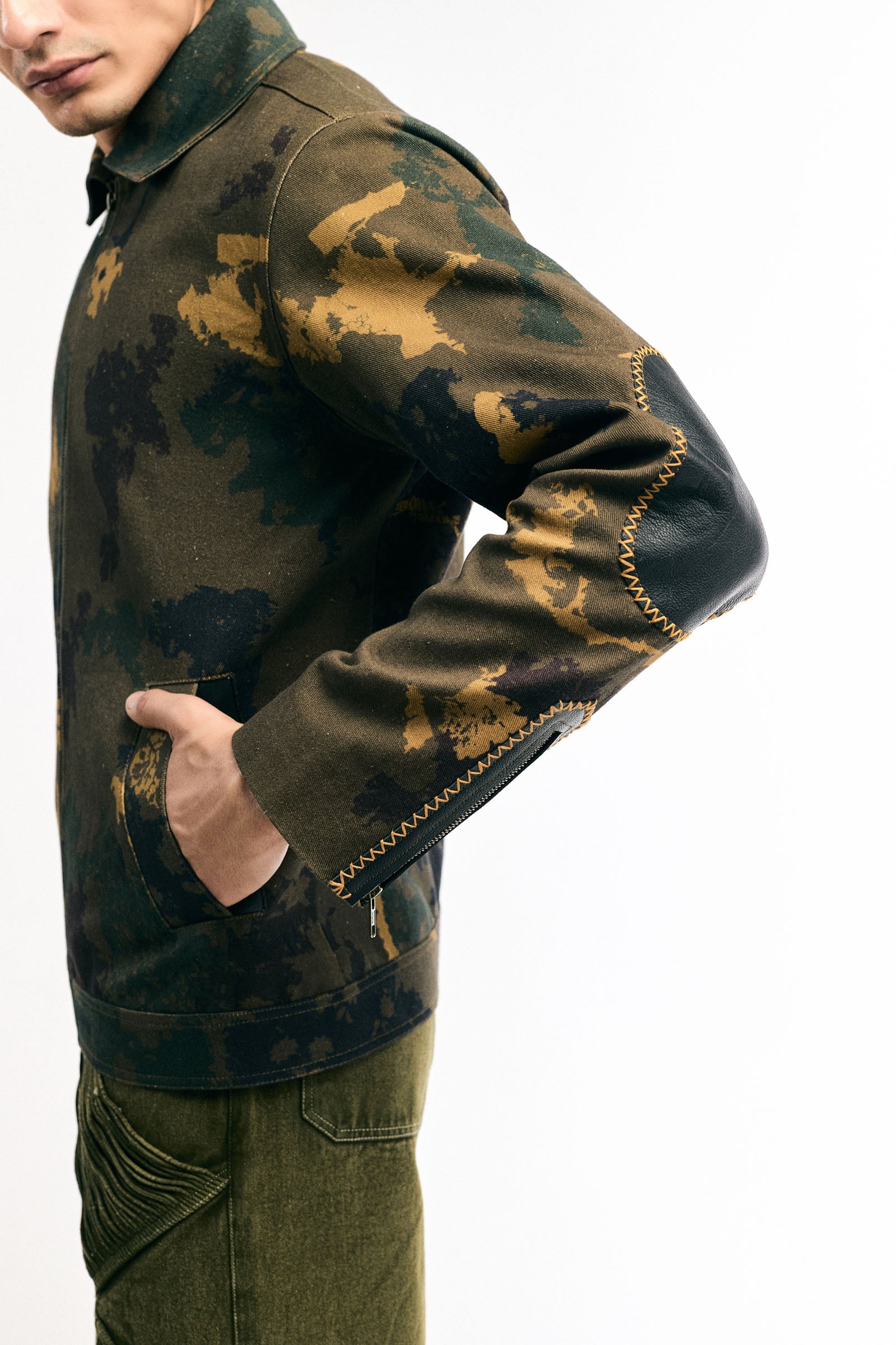 Features: High-density textile featuring multi-tonal digital camouflage print; leather reinforcements at the elbows and shoulders accented with distinctive visible hand-embroidered zig-zag stitching across leather panels; straight pointed collar with a durable metal zipper closure