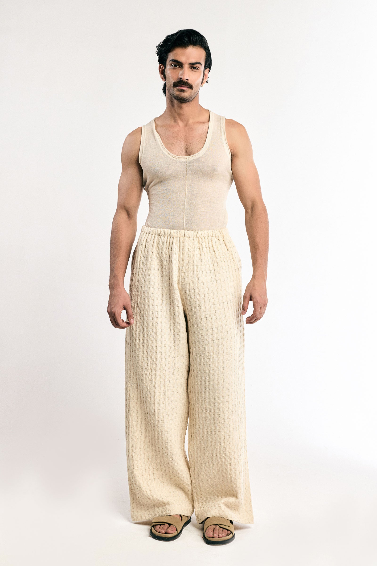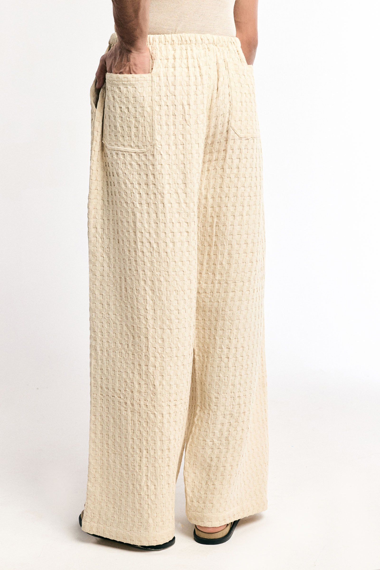 Features: Relaxed fit; premium honeycomb cotton weave with a textured finish; fully elasticated waistband