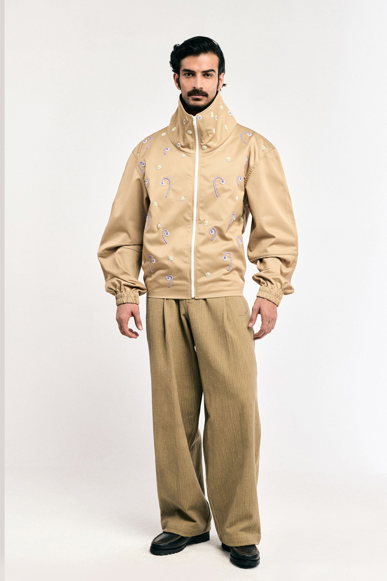Features: Premium cotton jacket featuring intricate embroidery with couched dori work, saali (bugle beads), delicate French knots, and threadwork; sleek single welt pocket and elasticated cuff detailing; modern high-collar profile with a durable front metal zipper closure