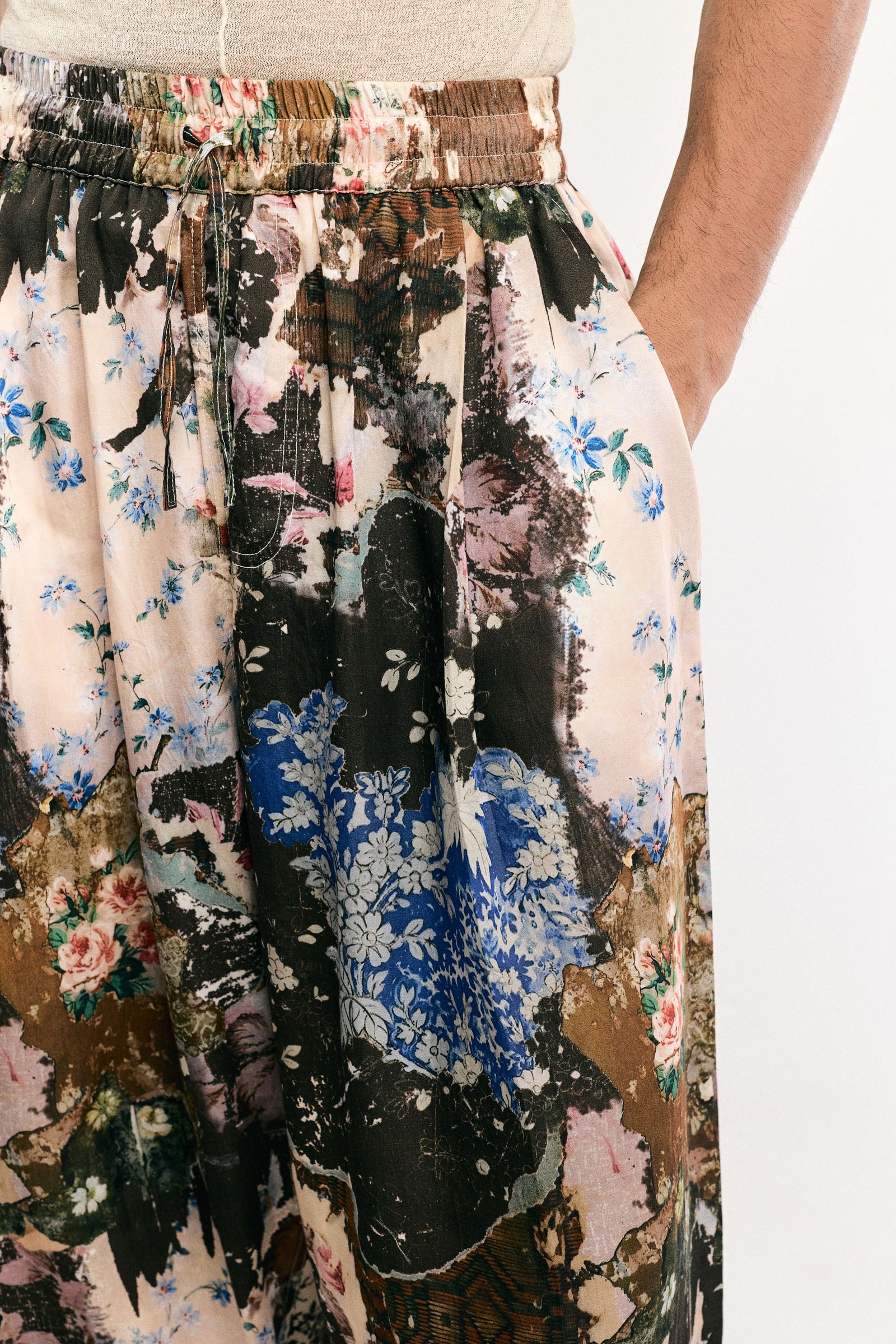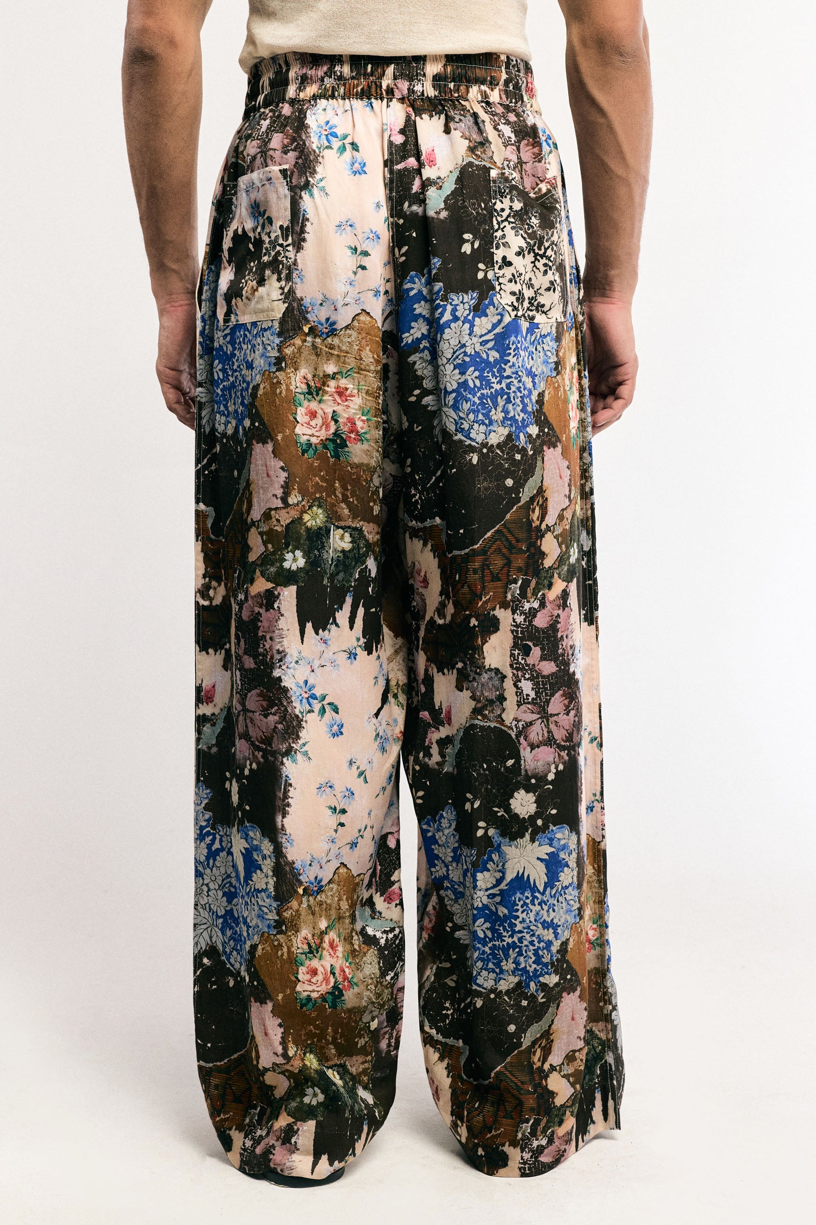 Features: Loose relaxed fit featuring a vibrant digitally printed patina; front pleat detailing for added volume and structure; elasticated waistband with adjustable drawstrings
